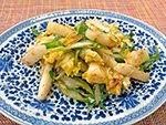 2025/11/14 長芋と卵の中華炒め 11/14 長芋と卵の中華炒め ★材料 2人分 長芋150g 片栗粉大さじ1 サラダ油大さじ2 卵3個 塩、コショウ各少々 ニンニク1片 長ネギ(青味含む)1/2本 日本酒大さじ1 鶏ガラスープの素小さじ1 オイスターソース小さじ1 1.長芋は4cm長さの拍子切りにし、片栗粉をまぶし、フライパンにサラダ油を入れ中火でカリカリに揚げ焼きにする。 2.別のフライパンにサラダ油(大さじ1)を入れ、溶き卵に塩、コショウで味をつけ半熟の炒り卵を作り、取り出す。 3.ニンニク(みじん切り)を入れ、長ネギ(縦半分に切り、厚めの斜め切り)を炒め、日本酒を入れ、しんなりしたら鶏ガラスープの素、オイスターソース、1の長芋、2の卵を戻し入れ、あわせてお皿に盛る。