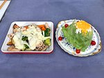 2026/01/23 レタスの中にポテトサラダケーキ 01/23 レタスの中にポテトサラダケーキ ★材料 4~6人分 レタス1個 ジャガイモ3個 ニンジン1本 ホウレンソウ2株 マヨネーズ60~70g マスタード小さじ1 塩小さじ1/2 ゆで卵1~2個 ミニトマト6個 1.レタスは外側の葉を3枚ぐらい残し根元から中をくり抜く。 2.ジャガイモは皮をむき粗めにつぶす。ニンジンは5mm角で、ホウレンソウは1cmの長さに切り、水気をしっかりしぼっておく。 3.ボウルに2を入れマヨネーズ、マスタード、塩を混ぜポテトサラダを作る。 4.レタスを上に向けてボウルに入れ、空間にポテトサラダを詰める。 5.お皿をかぶせボウルごと返す。上に白身、黄身に分けたゆで卵をそれぞれザルで濾し、上にかける。周りにミニトマトを飾る。