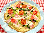 2026/02/26 フワッと ポテトロけるピザ 02/26 フワッと ポテトロけるピザ ★材料 2人分 ジャガイモ250g 卵1個 片栗粉大さじ1と1/2 塩小さじ1/2 オリーブ油適量 ピザ用チーズ50g 玉ねぎ1/4個 ベーコン2枚 野沢菜適量 ミニトマト適量 1.ジャガイモはすりおろす。(新ジャガは水分が多いので大さじ2位水分を取りのぞく) 2.1に卵、片栗粉、塩を入れて混ぜる。 3.フライパンに油を入れ生地を入れて焼く。裏返す。 4.ピザ用チーズをのせて、玉ねぎ(薄切り)、ベーコン(1cm幅)、ミニトマト(薄切り)、野沢菜(粗みじん切り)をのせて、チーズが溶けるまで焼く。