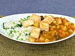 5.ご飯にカブの葉(細かくして)を混ぜる。ご飯の上に揚げた豆腐をおいてカレーをかけて頂く。