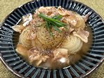 2026/04/23 新玉ネギのトロトロ豚トンあん 04/23 新玉ネギのトロトロ豚トンあん ★材料 2人分 新玉ねぎ中2個~3個 豚バラ肉100g 醤油小さじ1 酒小さじ1 だし汁400cc 醤油大さじ1と1/2 みりん大さじ1と1/2 塩小さじ1/2 片栗粉大さじ1/2 水大さじ1 粗挽きコショウ少々 1.玉ねぎは上下を切り落とし横半分に切る。豚肉は醤油と酒で下味を付ける。 2.鍋で豚肉を炒め、だし汁と調味料を入れる。沸騰したらあくを取り、玉ねぎを並べ入れて落とし蓋をして玉ねぎが柔らかくなるまで20~25分煮る。 3.皿に玉ねぎを盛り、残りの汁に水溶き片栗粉を回し入れてとろみを付ける。 4.玉ねぎの上に豚あんをかけて粗挽きコショウを振る。