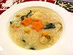 2020/12/23 レンコンとシーフードのぽったりスープ 12/23 レンコンとシーフードのぽったりスープ ★材料 2人分 レンコン200g ベーコン(細切り)1/2枚 ニンニク(みじん切り)小1片 タマネギ(細切り)1/6個 オリーブ油小さじ2 コンソメスープ2カップ シーフードミックス150g ひよこまめ(茹で)60g 塩・コショウ適量 ほうれん草(茹で)40g ニンジン(星形)適量 1.レンコンは皮ごとすりおろす。 2.フライパンにオリーブ油を熱しベーコンを炒め、ニンニクとタマネギを入れて炒める。 3.コンソメスープを加え、一煮立ちさせ、1とシーフードミックス (エビの背ワタを取る)を加えかき混ぜながら火を通す。 4.ひよこまめを加え、塩・コショウをして味を調え、ほうれん草を加え混ぜ、盛り付ける。 5.ニンジン(星形)を浮かす。 ☆レンコンのデンプンでトロミをつける