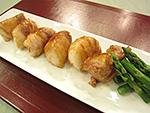 2021/03/26 肉巻きタマネギの甘辛焼き 03/26 肉巻きタマネギの甘辛焼き ★材料 2人分 新タマネギ1個 片栗粉適量 豚肉(しゃぶしゃぶ用)100g サラダ油適量 麺つゆ大さじ1と1/2 砂糖小さじ1 水大さじ1 アスパラガス2本 1.新タマネギは6等分のくし形切り、2分レンジで加熱。ペーパーの上に取り、冷まして片栗粉をまぶす。 2.しゃぶしゃぶ用の豚肉をまな板の上へ並べ、片栗粉を全体にふり、1のタマネギを豚肉で巻き、なじませ、もう一度片栗粉を全体につける。 3.フライパンにサラダ油をひき、中火で2の豚肉に焦げ目がつくように焼く。 4.豚肉を焼いている間にAを混ぜ合わせ、3にからめ火を止める。 5.器に盛り、アスパラを添える。