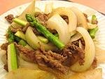 2021/06/04 新玉と牛肉の甘みそ炒め煮 06/04 新玉と牛肉の甘みそ炒め煮 ★材料 2人分 新タマネギ大1個 サラダ油小さじ2 ~A~ みそ大さじ1強 砂糖大さじ1 しょう油小さじ2 みりん大さじ1 酒大さじ1 牛肉切り落とし150g アスパラ2本 和風顆粒だし小さじ1/4(少々) 1.タマネギは8等分のくし型に切り、バラバラにしてレンジで2分30秒加熱する。 2.フライパンに油を入れ、温めておく。 3.Aの調味料をまぜる。 4.フライパンに牛肉を炒め、少し色が変わったらタマネギ、3cm長さに切ったアスパラを炒める。 5.油がまわったら、3をまわしかけ、和風顆粒だしをふり、味がなじむようフタをして炒め煮する。