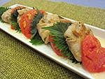 2021/08/10 ナスのみそ肉巻き 08/10 ナスのみそ肉巻き ★材料 2人分 みそ大さじ1 砂糖小さじ1 みりん大さじ1 サラダ油小さじ1 丸ナス1個 豚バラ肉6枚 小麦粉適量 トマト1個 青じそ4枚 1.みそ、砂糖、みりん、サラダ油を混ぜる。 2.ナス(5mm厚さに切り込みを入れ、1cmの輪切りにする)に合わせみそを挟む。 3.豚肉を十字に置き、ナスを包み、小麦粉を振る。 4.フライパンに巻き終わりを下にしてナスを並べ、フタをして蒸し焼きにする。 5.ナスを返して、トマト(輪切り)を入れて焼く。 6.青じそと一緒に盛り付ける。