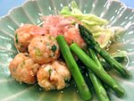 2022/03/29 春キャベツとえび団子のさっと煮 03/29 春キャベツとえび団子のさっと煮 ★材料 2人分 むきえび100g はんぺん1枚 細ネギ(みじん切り)1本 ニンジン(すりおろし)大さじ1 酒大さじ1 片栗粉大さじ1 水300cc めんつゆ(4倍)30cc アスパラガス(5cm)2本 キャベツ(大きめにちぎる)1枚 花かつお節適量 1.むきえびを粗みじん切りにし、たたく。 2.ビニール袋にはんぺんをちぎって入れ、滑らかになるまで潰す。 3.2にえび、細ネギ、ニンジン、酒、片栗粉を加え粘りが出るまでよく揉み、丸める。 4.鍋に水、めんつゆを入れ沸騰したらえび団子を入れ煮る。 5.えび団子が浮いてきたらアスパラガス、キャベツを入れ、ひと煮立ちしたら盛り付け、かつお節をのせる。