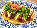 2022/06/24 大阪のいか焼き 06/24 大阪のいか焼き ★材料 1人分 ~A~ 小麦粉40g 片栗粉小さじ1 和風顆粒だし小さじ1/3 水100cc いか70g サラダ油小さじ2 卵1個 おこのみ焼きソース適量 マヨネーズ適量 小ネギ(小口切り)適量 紅ショウガ適量 1.ボウルにAを入れ、混ぜる。 2.いかは5mm幅の輪切り、足は長さ4cmに切る。 3.1に2を入れ混ぜる。 4.フライパンにサラダ油を入れ、熱くする。 5.3を流し入れ、卵を割り入れる。 6.卵黄をつぶして下がこげ色がついてきたら返す。 7.ヘラで押して両面をカリカリに焼き色をつける。 8.ソースを片面全体にぬり、半分に折って皿にのせる。 9.マヨネーズをかけ、小ネギをたっぷりと全体にふり、真ん中に紅ショウガをおく。