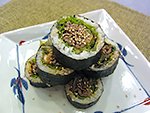 2022/10/18 韓国風太巻き 10/18 韓国風太巻き ★材料 1本分 牛こま切れ肉80g 砂糖小さじ1 しょう油小さじ1 みりん小さじ1 コチュジャン小さじ1 ご飯150g 塩ひとつまみ ゴマ油小さじ1/2 焼き海苔1枚 サニーレタス2枚 キムチ30g 白炒りゴマ適量 1.フライパンに牛肉、砂糖、しょう油、みりん、コチュジャンを入れよく揉み、汁気がなくなるまで炒める。 2.ご飯に塩、ゴマ油を混ぜる。 3.ラップに海苔、ご飯、サニーレタス、キムチ、焼肉をのせ巻く。 4.8等分に切って皿に並べ、ゴマをふる。