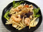 2023/08/02 シーフードとジャガイモのさわやかセロリ炒め 08/02 シーフードとジャガイモのさわやかセロリ炒め ★材料 2人分 シーフードミックス(冷凍)150g 酒大さじ1 塩・コショウ適量 片栗粉小さじ2 ゴマ油大さじ1 ニンニク(薄切り)1片 セロリ1本(80g) 生きくらげ40g ジャガイモ1個 塩・コショウ適量 すし酢大さじ2 粗挽き黒コショウ適量 1.シーフードは氷水1カップに塩小さじ1を加えて30分解凍して酒をかけ、冷蔵庫で解凍(1時間位)→水分を絞り塩・コショウして→片栗粉をつけ、ゴマ油で焼き炒める→取り出す 2.ニンニクを炒め→セロリ・きくらげを加え炒める 3.ジャガイモ(太めの千切りしレンジ600W2分位)を加え炒める 4.塩・コショウしてすし酢を回し入れサッと炒め盛り付ける 5.粗挽き黒コショウを振りセロリの葉を添える