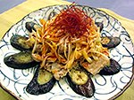 4.2のナスの上に1の豚肉をのせ、3のネギみそをのせ、赤糸唐辛子をのせる。
