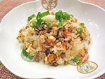 2024/01/09 おもちとご飯で中華おこわ風 01/09 おもちとご飯で中華おこわ風 ★材料 2人分 ご飯200g 餅(5mm角)1/2個 豚バラ肉50g シイタケ(粗みじん切り)1枚 ニンジン(粗みじん切り)20g 油揚げ(粗みじん切り)1/2枚 ゴボウ(粗みじん切り)1/3本 砂糖小さじ1 醤油大さじ1 みりん大さじ1 ゴマ油小さじ1 細ネギ(小口切り)1本 1.ご飯にもちを混ぜ、ラップをして電子レンジ(600W)で2分加熱する。 2.フライパンに豚バラ肉、シイタケ、ニンジン、油揚げ、ゴボウを炒める。 3.砂糖、醤油、みりんを加え、ゴマ油を回しかける。 4.1を電子レンジから取り出し、熱いうちによく混ぜ、2を加え更に混ぜる。 5.器に盛り、細ネギを散らす。