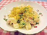 2.鍋に1と卵をひたひたの水と塩を入れて茹でる。(沸騰後6~7分) 卵は水に取り出し、殻をむき、黄身1個を除きざっと切る。 じゃがいもはザルに上げて冷ます。
