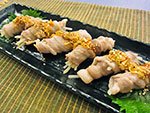 2024/01/18 ピリ辛豚巻きもやし 01/18 ピリ辛豚巻きもやし ★材料 2人分 豚バラ肉薄切り6枚 塩・コショウ少々 もやし1/2袋 長ネギ5cm 生姜1/2片 ~A~ 醤油大さじ2 酢大さじ1 砂糖大さじ1 ゴマ油小さじ1 豆板醤小さじ1/2 大葉適宜 白炒りゴマ適量 1.豚バラ肉に塩・コショウをふる。 2.ひげ根を取ったもやしを豚バラ肉の上におき、端から巻く。 3.耐熱皿に並べ、ラップをして電子レンジ(600W)で3分加熱する。 4.長ネギ、生姜をみじん切りにし、Aの材料とともに混ぜてタレを作る。 5.加熱しおわった3は水分を軽く切り、大葉を敷いた皿に盛る。4のタレをかけ、白炒りゴマをふる。 ★ポイント★ 電子レンジで加熱後、水分を捨てることで水っぽくならずに仕上がる。