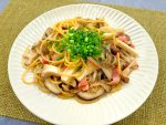 2025/10/03 きのこたっぷり和のパスタ 10/03 きのこたっぷり和のパスタ ★材料 1人分 パスタ100g オリーブ油大さじ1 ニンニク(スライス)1片 赤唐辛子(スライス)1/2本 ベーコン1と1/2枚 お好みのキノコ150g パスタゆで汁100cc 醤油大さじ1 和風顆粒だし少々 黒コショウ少々 細ネギ適量 1.熱湯(1リットル塩小さじ2)にパスタを入れ茹でる。 2.フライパンにオリーブ油、ニンニク、赤唐辛子を入れ、泡が立ってきたら1cm幅に切ったベーコンを入れ炒める。 3.小分けにしたキノコ類を入れパスタ、パスタの茹で汁、醤油、顆粒だしで味を調える。 4.お皿に盛り細ネギ(小口切り)をのせる。