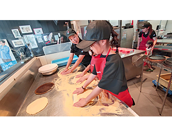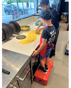 ピザの生地を作るときに回しながら伸ばしていくことを教えてもらいました。生地がどんどん伸びていくのが面白かったです。おいしいピザが作れて嬉しかったです。
