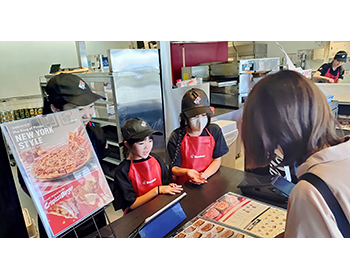 ピザの作り方を知らなかったから、知れて良かった。ピザの具も自分で選べたし、自分の思うようにトッピングができて、焼き上がるのが楽しみだった。自分で作ったピザはおいしかったし、エプロンや帽子もかぶれて、本当のお店の人みたいで嬉しかった。レジも初めてやってみたけど、難しかったです。