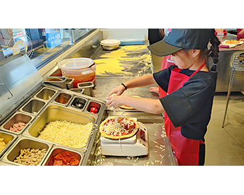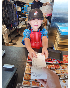 ピザ作りは、好きなトッピングを選ぶことができて楽しかったです。そして自分で作ったピザはとても美味しかったです。レジをやらせてもらえたのも楽しかったです。レジの中にはこんなにお金が入っているんだなと思いました。おつりを渡すことができて嬉しかったです。