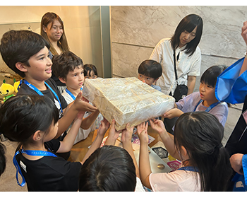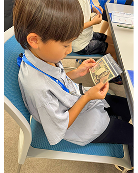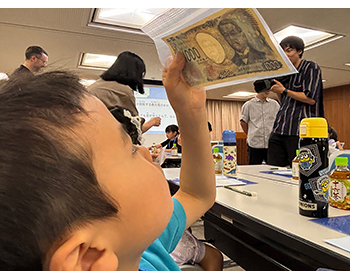 こー身近にあるお札についてじっくり見られておもしろかった。1億円には歓声が上がった。