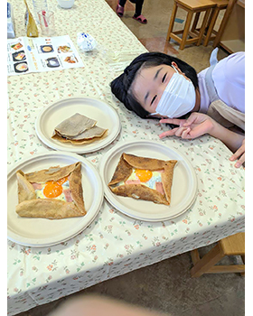 私は今日おしごと体験をやって、楽しかったことはガレット作りです。ガレットとはフランスで生まれたクレープのようなものでクレープにとても似ていますが小麦粉ではなくそば粉て作られているようです。私はごはん系のと、デザート系のガレットを作りました。ごはん系は、卵とハムとチーズを乗せてやきました。デザート系は、クレープの様に生クリームとジャムを乗っけて作りました。クレープとは違ってガレットはそば粉が関係しているのかは分かりませんが、クレープとは違生地じたいがわりと甘くないのでもたれずに食べることができました。ほかにも作り方をしらべたりしてみたいと思いました。