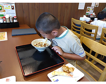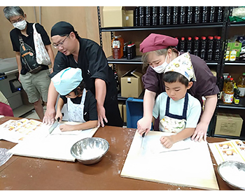かすみよく利用するお店なのでこちらのうどんを気軽に食べていましたが、麺うちが何工程もあり大変な作業だったとは知りませんでした。足踏み作業も1年生の我が子にはなかなか力のいる仕事でしたがちゃんと説明を聞いて、真剣に取り組めたようでした。自分で切った太めのうどんも食べることが出来て疲れたけれど楽しかったようです。