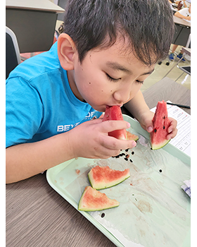 ケイトセリの手ふちょうを教わったり、家庭菜園のスイカとブランドスイカの食べ比べをしたりしました。おいしいスイカが、市場でねだんを付けられて、スーパーで売られることがわかりました。