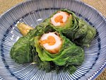 2022/02/24 ちくわの和風ロールレタス 02/24 ちくわの和風ロールレタス ★材料 2人分 レタスの葉4枚 ニンジン5cm程度 生食用ちくわ2本 パスタ1本 水350cc 酒大さじ1 しょう油小さじ2 和風だしのもと小さじ2 塩小さじ1 辛子適量 1.レタスの葉は洗って耐熱皿にのせる。ニンジンは千切りにしてレタスの上におき、ラップをして電子レンジ600Wで2分加熱して取り出す。 2.ニンジンをちくわの中に詰める。 3.レタスの葉を2枚重ねてちくわをおいて巻き、巻き終わりはパスタでとめる。 4.鍋に水、酒、しょう油、和風だしのもと、塩を加えて火にかけ、沸騰したら3を入れて2分程度煮る。(煮すぎない) 5.半分切って器に盛り、辛子を添える。