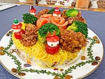 2025/12/19 惣菜で!? Xmasちらしずしケーキ 12/19 惣菜で!? Xmasちらしずしケーキ ★材料 18cm丸形 ~ちらしの具~ ニンジン70g 椎茸3枚 高野豆腐(細切り)15g だし汁100cc 砂糖大さじ1 みりん大さじ1 薄口醤油大さじ2 ~酢飯~ ご飯2合 粉末すし酢大さじ2 ~錦糸卵~ 卵3個 砂糖大さじ1 塩小さじ1/2 ~装飾用~ ブロッコリー(茹で)小分けにし5個 鶏唐揚げ(お惣菜)5個 サーモン(刺身用)9枚 ~サンタクロース~ ミニトマト4個 モッツァレラチーズ4個 黒ゴマ8粒 1.ニンジン、椎茸は細切りにし、高野豆腐、だし汁、砂糖、みりん、薄口醬油を鍋に入れ、沸騰したら弱火で汁気がなくなるまで煮る。 2.炊き立てのご飯に粉末すし酢を混ぜ、1のちらしの具材を混ぜる。 3.ケーキ型に錦糸卵を全体に敷いて、その上に2のちらし寿司を置く。 4.皿をふたにしてひっくり返しケーキ型を外す。 5.サーモンを巻いて作ったバラの花を中心に置いてブロッコリー、鶏唐揚げ、トマトのサンタを飾る。