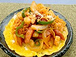 3.2に麺を入れて炒める。麺がほぐれたら残りのケチャップで味付けをする。お皿に薄焼き卵を引いて、その上に焼きそばナポリタンを盛り付け、お好みで粉チーズをふる。