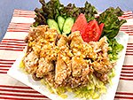 2026/04/09 サクサク揚げ焼きチキン 04/09 サクサク揚げ焼きチキン ★材料 2人分 鶏もも肉1枚(300g) 塩・コショウ適量 酒適量 片栗粉適量 揚げ油適量 長ネギ(みじん切り)1/3本分 ショウガ(すりおろし)1/2片分 砂糖大さじ1 醤油大さじ1 酢大さじ1 1.鶏もも肉は、余分な脂をきちんと取り除き、塩・コショウで下味をつける。 2.片栗粉をまぶして、皮を下にして揚げ焼きする。食べやすく切る。 3.キャベツなどお好みの野菜を皿に盛り、揚げた肉をのせる。 4.長ネギ、ショウガ、砂糖、醤油、酢を混ぜ合わせ、肉が熱いうちに上からかける。 【ここが大事!!】 ・鶏肉に片栗粉をたっぷりとまぶす ・肉が熱いうちにタレをかける
