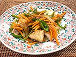 2026/04/24 サワラのあま酢あんかけ 04/24 サワラのあま酢あんかけ ★材料 1~2人分 さわら80~100g 片栗粉適量 サラダ油大さじ1と1/2 サラダ油小さじ1 人参(30秒加熱)50g 玉ねぎ70g ピーマン1と1/2個 だし汁100cc ~A~ 醤油大さじ1 砂糖大さじ1 米酢大さじ1 水溶き片栗粉適量 1.さわらは5~6等に切り片栗粉をつける。 2.フライパンにサラダ油を入れ皮を下にして中火で3分返して1分焼色を少しつけてあげ焼きにする。 3.フライパンにサラダ油を入れ中火で細切りの人参、玉ねぎ、ピーマンを炒め、だし汁、Aを入れ炒め煮して水溶き片栗粉で好みの固さにトロミをつける。 4.あんかけ2/3量を器においてその上にさわらをおき、残りのあんかけをかける。